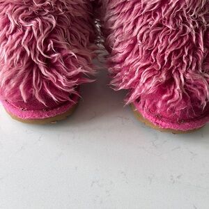 Adorable pink furry baby booties with cute bow accents. Perfect for keeping little feet warm and stylish.