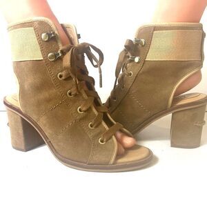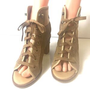 Ugg Womens 7 Brown Suede Peep Toe Ankle Bootie Sling Back Comfort Heels Tie Shoe