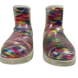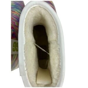 Keywords: Ugg, bootie, women's footwear, size 5, multicolor, pixelate pattern, waterproof boots, fall boots, synthetic material, comfortable lining, durable sole, pull-on boots, pre-owned Uggs, iconic branding.