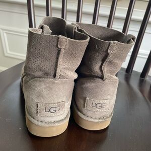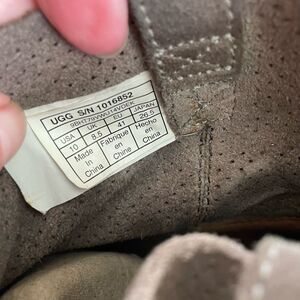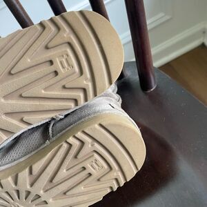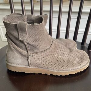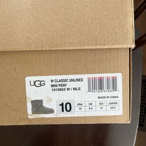 Ugg Women's Classic Unlined Mini Perf Boots in mole, which is a true taupe color that is across between beige and gray. Ugg Women's Classic Unlined Mini Perf Boots are a luxe update to the Classic Mini, crafted from soft suede and left unlined for a lightweight feel. They feature an innovative Treadlite by UGG sole for lightweight traction on any surface. These boots are ankle height. Reviews note that they are comfy and cute, and make a great fashion statement. Come with the box and even the purchase receipt from Macy’s. Lots of life left to the tread, I really don’t see much wear at all.