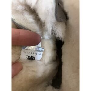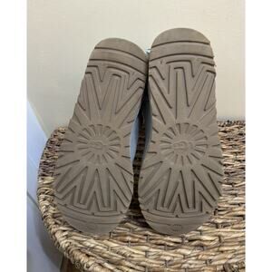 The product is a stylish and cozy Ugg Women's Gray Bootie featuring a lace-up closure, a cute bow accent, and shiny silver snowflakes detailing. Made with fur lining and upper material, this bootie is perfect for cold weather and adds a touch of elegance to any outfit. The silver accents and bow detail add a feminine and trendy touch to the overall design, making it a fashionable choice for women looking for a versatile and comfortable boot.