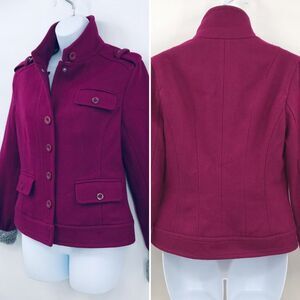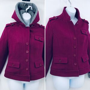 Ugg wool cropped fitted jacket with detachable Sherpa lined hood and Sherpa around wrists on sleeves (sleeves can fold down to reveal less sherpa). Signature logo on buttons and zipper pull. Functionable front and chest pockets. Collar buttons up to keep out the cold. Pea coat style without hood. Deep violet mulberry purple color.