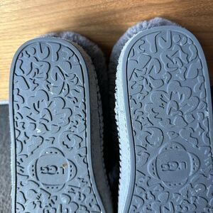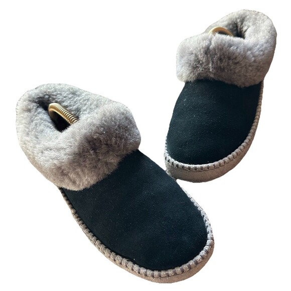Ugg Wrinn Shearling Cuffed Slippers, size 8. Black suede uppers with shearling cuff and wool lining. The soles are in excellent condition. The interior wool shows signs of wear. There are small, light stains & marks on the suede.
