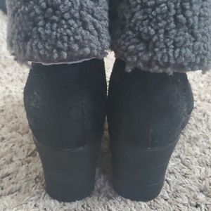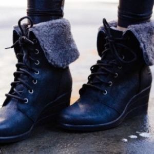 Waterproof full-grain leather. Sealed seams.Spider rubber outsole provide dry comfort and traction on rainy days. Sleek 2 1/2" wedge. Foldable wool collar. Like new. Only sign of wear in on bottom and is minimal.