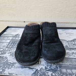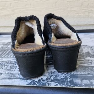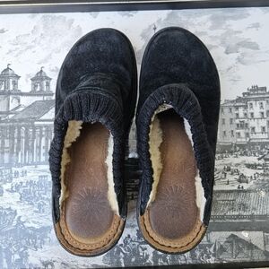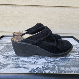 Black suede wedge mules with ribbed black collar and shearling lining. Insoles are suede. Outers are a synthetic rubbery material. Wedge measures approximately 2.25".