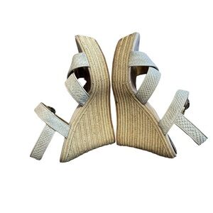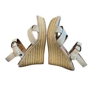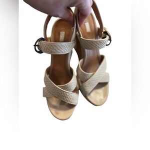 Clean and smoke free home. Ugg women’s size 7.5 cream colored wedge sandals. In good used condition with some general wear. Fast shipping. All reasonable offers accepted.