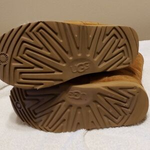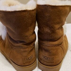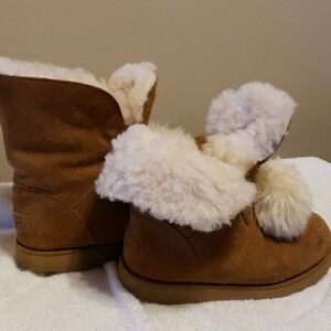 Very warm fluffy wool throughout boot tan leather uggs there is a stain on back of heel that isnt noticeable when they are flipped down and barely noticeable when flipped up. Still fluffy soles show little to no wear actual boots pictured above please reference for condition thank you for looking size 4