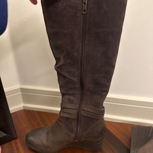 Hardly worn Ugg wedge boots with full zip up closure and adjustable strap at calf.