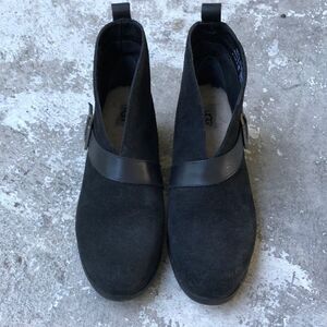 These are black suede with a leather strap. Soles are very good. If you see the pictures you will see that the heel has slight fading Which you can polish out. Inside says EU 40 US 9 1/2. To me there are 40
