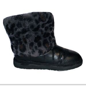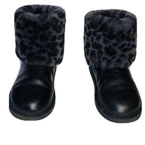 Black boots with animal print fold per fur. Has a decorative buckle on the outside ankle area. Some white spots in the toe box area along with creasing in the toe box area. Fur insole has foot impressions. In overall good condition
