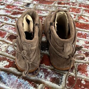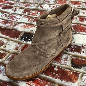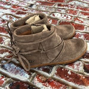 UGG brand moccasin style gray and tan ankle boots. Excellent condition no damage.