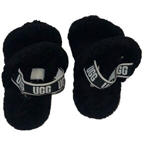 Good, preloved condition. Ugg Oh Yeah Black Sandals Girls sz 3 Strappy Sheepskin Logo Spell out Cozy.