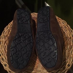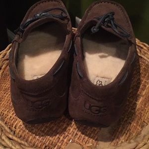 Authentic used men’s Uggs Loafers/slippers. Brown suede with blue leather size 8