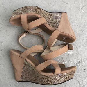 Platform UGGs that have an iridescent snake skin print. As you see from the pictures the back of the heels need to clean up but the shoes themselves are in good condition. Platform height is 1.5 inches heel height is 4.5 inches