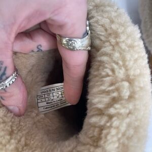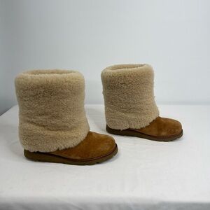 Warm shearling boots with a soft tan and cream fold over look. Has solid soles and suede on the top.