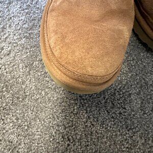 These Uggs have been worn, a little water stain indicated in one of the pictures, and a tear in the elastic part as seen in a picture- the tear could be sewn together, but I do not possess those skills. Size 11, and the typically light brown color that Ugg is known for—mini length.