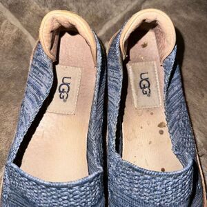 Uggs heathered blue, striped, comfortable, breathable, stretchy, slip on loafers. White sole. Some discoloring, untreated staining insole. From a pet and smoke free house. Happy to bundle!