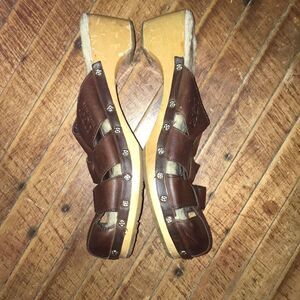 Ugg Sheepskin lined insole. Leather upper sandal. Wood heels. Super cute and comfortable! Some signs of wear, but in good shape. From a pet and smoke free house. Happy to bundle!