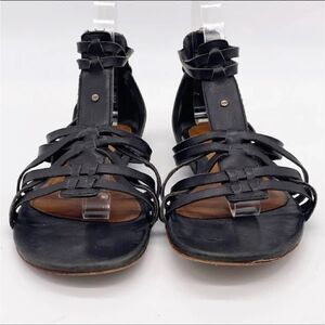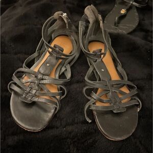 sandals are well loved on the left sandal there is one strap that needs to be glued in on one side the other side could also use with glue I have enclosed pictures so sandals can be fixed both zippers are functional souls are use interior looks good if you have any questions please feel free to message me