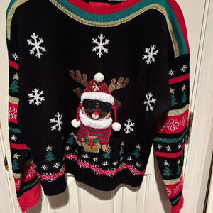 Get ready to turn heads and bring the holiday cheer with this hilarious Ugly Christmas Sweater featuring a festive dog decked out in style! This sweater has everything you need to be the life of the party – a cute pup sporting sequin sunglasses and playful deer antlers, all set against a classic black backdrop.