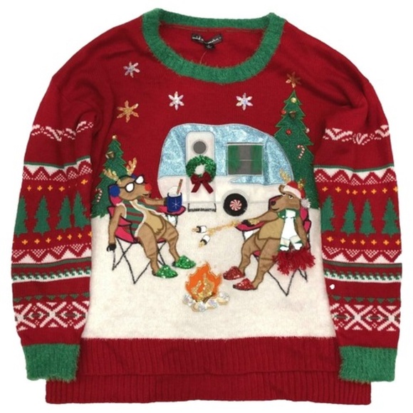 This is the cutest sweater featuring reindeer relaxing in front of the fire having some hot coco in front of a camper