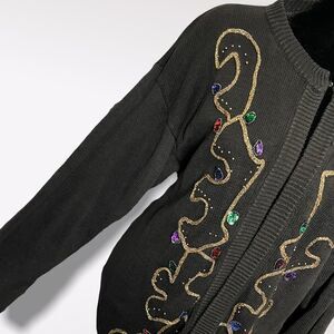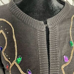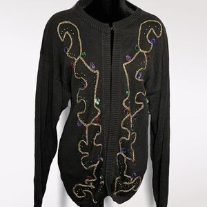 Gorgeous black and gold Open cardigan style sweater. Has multicolored sequins. One hook and eye closure. There is embroidery, beaded, and sequin detail in the cardigan.