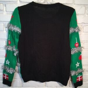 Condition is good pre-owned. Fun party sweater with a Cat theme and 2 bells that jingle. No brand tag. Tagged juniors XXL but runs more like a large. CS2 14oz