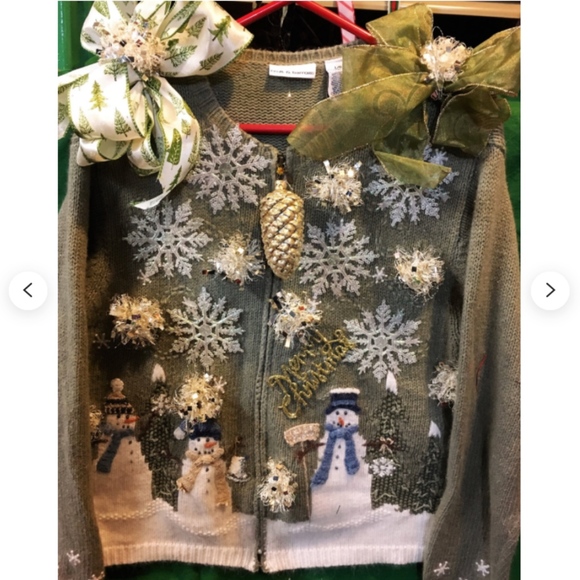 Croft and Barrow, light green/tan zippered, tacky, hand embroider, snowman sweater with 2 large bows and snowflakes. The back side has a stocking on board. All the festive Christmas goodies are hot glued onto gently used sweaters that are in great shape. You're sure to be a hit in these "one of a kind", fun and funky sweaters. Armpit to armpit 21.5”, length 25”. Measurements are approximate, taken while flat. Very clean from a smoke free home.