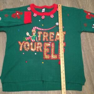 Condition is excellent pre-owned. Cute scoop neck party sweater with split hem. Very soft and stretchy. On a Holiday Time tag. Tagged size XL 16/18. 1 lb HCS1