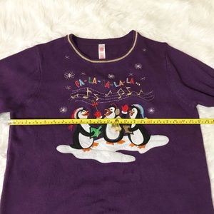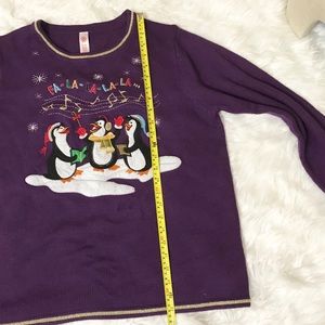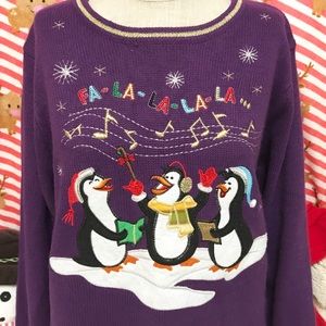 Great condition, women’s size XL (could fit a women’s Medium-XL in my opinion) Ugly Christmas Sweater! 🎄Purple crew neck sweater worth gold edge details on the neckline and sleeves. Three penguins 🐧 singing “Fa-La-La-La-La” with music notes! 🎶 Send me any offer 💕👍🏼