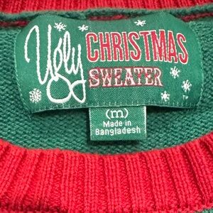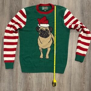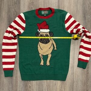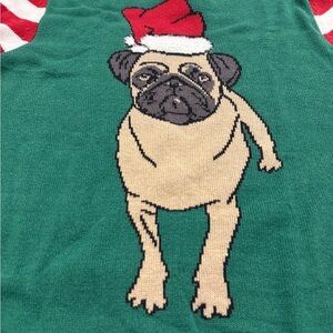 Festive crewneck with a pug in a Santa hat. Red and white striped sleeves. Perfect for holiday fun.
