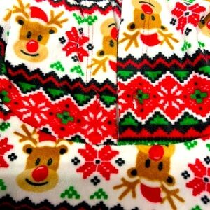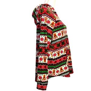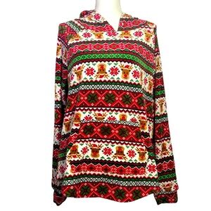Christmas Hoodie Women’s Ugly Christmas Sweater Hoodie Longer Length in a Fair Isle Reindeer Theme Print and in a Snuggly Buttery Soft Velvety Velour Material Front Pocket Red Green One Size