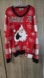 Festive red sweater featuring Santa and snowflakes. Includes playful bells for added charm.