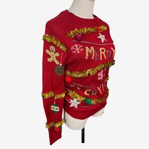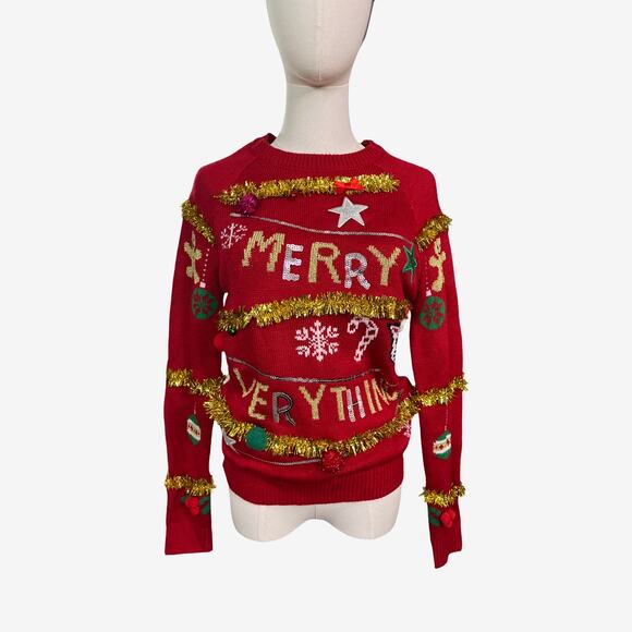Festive red holiday sweater featuring 3D tinsel garland, pom-poms, ornaments, gingerbread men, and “Merry Everything” text across the front. Perfect for holiday parties, ugly sweater contests, or Christmas photos. Soft acrylic knit with decorative embellishments.