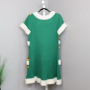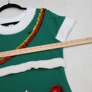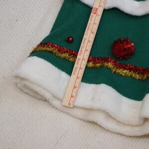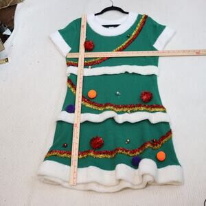 Festive Holiday Time women’s sweater dress styled as a Christmas tree. Features green knit with white fuzzy trim, metallic tinsel garland accents, colorful pom-poms, and ornament details. Fun and eye-catching choice for holiday parties, work events, or ugly Christmas sweater contests. Made from 100% acrylic (exclusive of decoration). Women’s size Large (12–14). Approximate measurements: 19” pit to pit, 36” length. Good pre-owned condition.