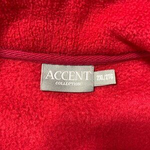 Get into the festive spirit with this ugly Christmas sweater fleece vest from Accent Collection. The red sweater features a collared neckline, button and zipper accents, and embroidered snowflakes, making it the perfect addition to your holiday wardrobe. The sleeveless vest is made of polyester with a tight-knit fleece fabric type, ensuring warmth and comfort during the cold winter season. This women's size 2XL sweater has a regular fit and is suitable for both casual and party/cocktail occasions. The bohemian, classic, and retro themes make it a fun and unique choice for the holiday season. The sweater is made in China and features a full zipper closure.