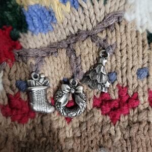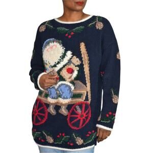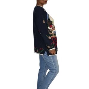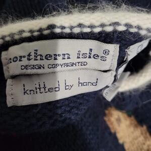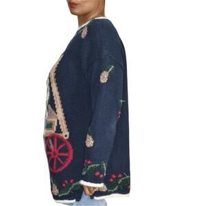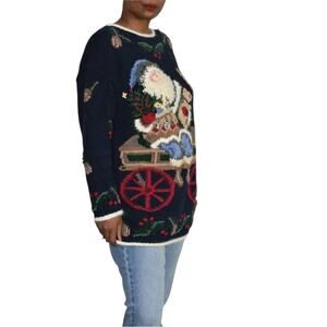 Northern Isles Christmas sweater FEATURES a holiday Christams theme with Santa Claus in a toy wagon holding a tree. Hanging wreath, tree, and stuffed stocking trinkets. Holly and pinecone border trim. Round neck. Long sleeves. Hand knit. Pullover.