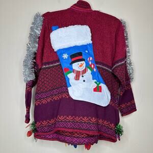 One of a kind Ugly Christmas Sweater! Each sweater is hand crafted by yours truly. I find the sweater which is the base and add each ornament, tinsel, Christmas lights, etc. and you get to enjoy without all that hassle!