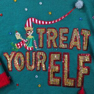 Ugly Christmas Sweater "Treat Your Elf" Size S With Festive Design & Sequins