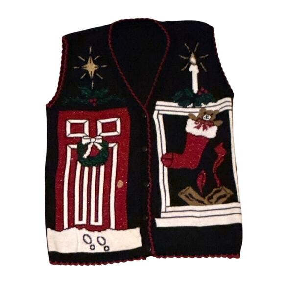 Festive holiday sweater vest in black with detailed appliqué panels—stockings, presents, stars, and winter greenery—done in classic red, green, and metallic tones. Longer 28” length and 19” shoulders make it ideal for layering over turtlenecks or cotton tees. Works well for December parties, teachers, performers, or anyone leaning into heritage winter styling, cottagecore holiday themes, or nostalgic Christmas fashion. Pair with long skirts, jeans, or boots from your shop for an easy seasonal look. Laundering recommended upon receipt.
