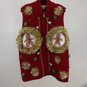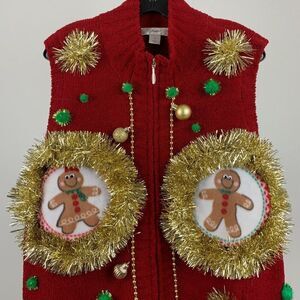 Description: Red sweater vest with zip front. Gingerbread circles at the bustline with garland. Added puff balls, beads, and ornaments. Unique and fun for your party!