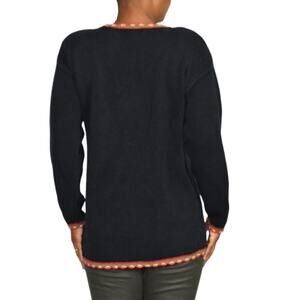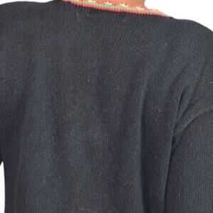 Vintage Work in Progress Christmas sweater FEATURES a holiday Christmas theme with large embroidered toy soldier in front with festive ornaments decorating the front. Colorful crochet trim. Round neck. Long sleeves. Shoulder pads. Pullover.