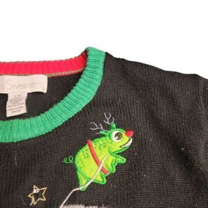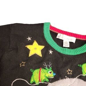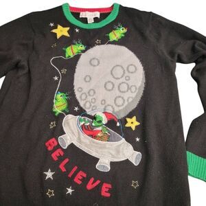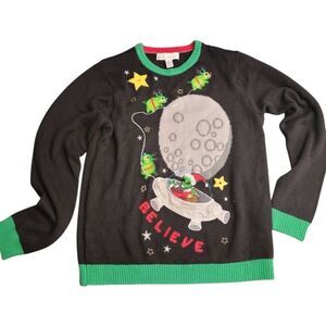 Ugly Christmas Sweater Winner Believe in UFO Aliens sz L In EXCELLENT condition with cute little aliens flying around UFO spaceship