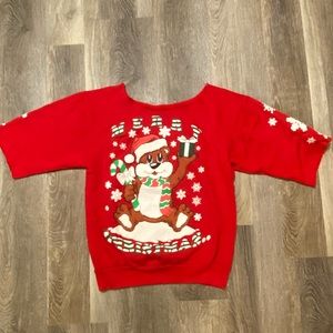 Ugly Christmas sweater. No size tag. Would fit a small or medium. Short sleeve. Merry Christmas on the front and happy new year on the back. Pre-owned.