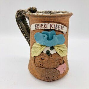 Ugly, silly-faced mug features an expert rider sporting a cowboy hat with his eyes crossed and tongue hangin out. Sure to bring a smile to any "expert rider." Measures nearly 5" tall and 4.25" in diameter, including the handle.