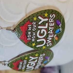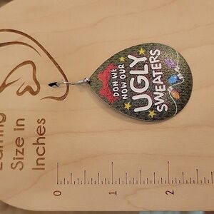 Ugly sweater holiday graphic on fishing lure style coated metal with hypoallergenic wires.