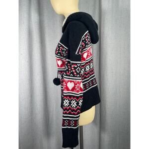 Ugly but Cute Christmas Sweater, Hooded, Adorned with Hearts, Snowflakes & Candy Canes The drawstring for the hood has to large Pom Poms added an extra touch to the fleece hood.