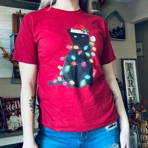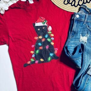 In good gently used condition. Perfect little t shirt for Christmas and kitty cat lovers! Basic red crewneck fit. Size small - has a semi-fitted fit.