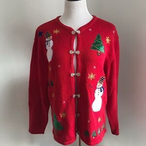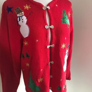Need a top for an Ugly Christmas Sweater Party? Here ya go! Just like Grandma would wear! Snowmen and xmas trees with front gold-tone hook closure Armpit-to-armpit 22”, sleeve 23” and length 26”.