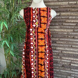 Vintage orange and red tribal print Hawaiian tiki maxi hostess dress